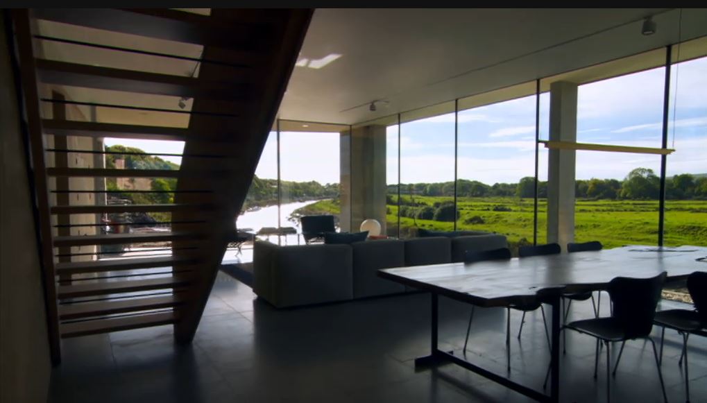 In this kind of program, we hear nothing about problems with cleaning these huge windows. It would be totally impossible in this house, because the house hangs over a river. We must hope that pigeons and other birds stay away!