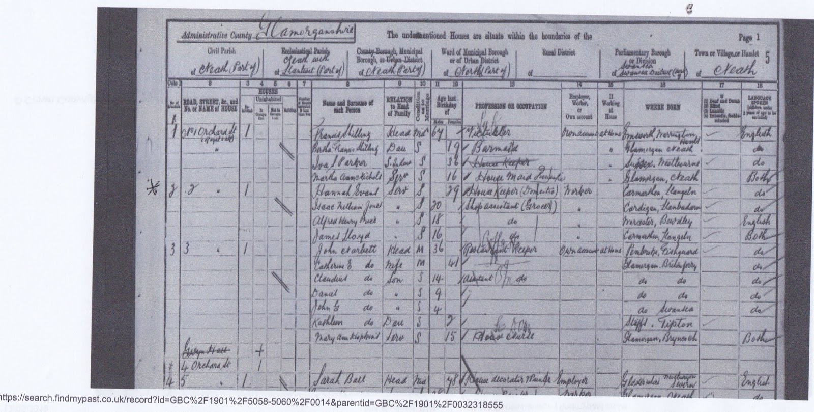 som ”husholderske” og sit bosted listet som Neath, Glamorganshire.