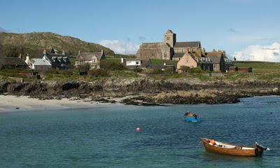 Iona's partially restored abbey and ruined nunnery as they appear when approached from the sea