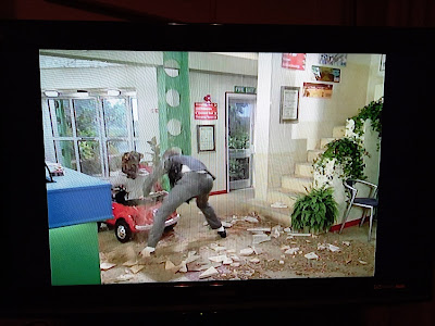 A newly-installed water tank is overfilled and starts falling through the centre's floors. Carole is stuck in Ben's miniature car in reception--the tank's final destination.