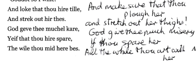 The old crow Dame Sirith unfortunately seems to take a lot of pleasure in telling Willikin "not to spare" young housewife Margery when he gets her into bed. She tells him to make sure he "ploughs" her, "tills her" and "stretches out her thighs".