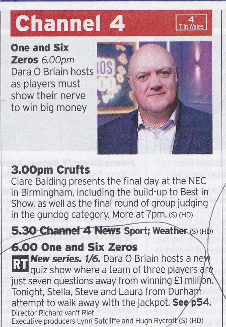 I settle back down on the couch and watch the first ever edition of a brand new quiz show, a sort of new take on the old "Who Wants To Be A Millionaire" show. This series is called "One and Six Zeroes" - geddit?