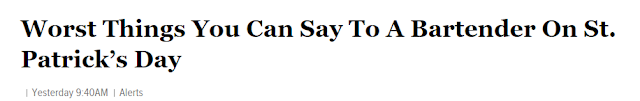 Later I see that America's influential news website, Onion News, has given American drinkers some useful information about things you should never say to an Irish bartender.