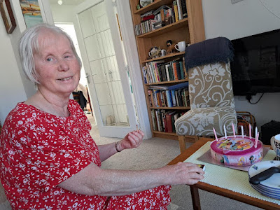 A pause, and we can take some time to celebrate the fact that it's also Lois's 77th birthday tomorrow, when Sarah and the twins won't be with us. As compensation, Lois lights the candles on her own birthday cake and we all have a piece. And Sarah plays the Happy Birthday song on the piano, which is nice. I've been teaching Jessie to play it, but she feels she hasn't practised it enough yet, so she asks her mum to step in and do the honours for Lois.