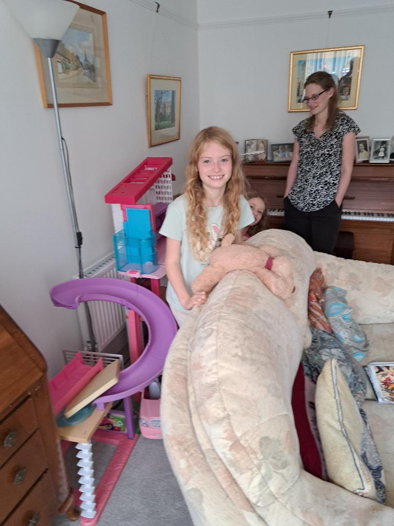 The rest of the day dissolves into some very enjoyable surprises and laughter. For the first time the twins see the Barbie House that Lois and I bought them for their 10th birthday last month, which has been stashed behind the sofa during our recent stay in Hampshire, house-sitting and pet-sitting for our other daughter Alison and family.