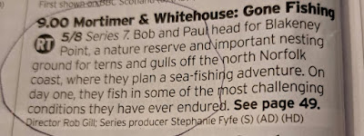 21:00 We go to bed on this week's programme in the "Gone Fishing" series, featuring ageing ex-comedians Paul Whitehouse and Bob Mortimer. This week the "boys" are trying to catch mackerel and bass off the coast of Norfolk.