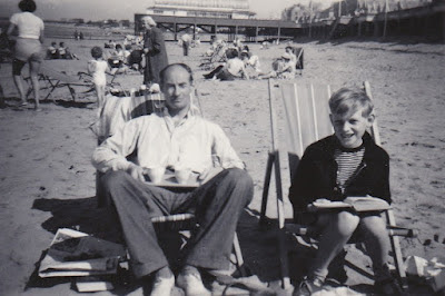flashback to August 1957: me reading on the beach at Burnham-on-Sea, Somerset,