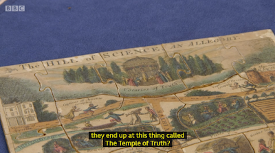 One of the heirlooms was a child's jigsaw dating from 1807. It depicts the path that wise children should travel: through the "gate of languages" (learning to read and write), and then proceeding along the right path, avoiding various traps, trials and tribulations - "the gulf of oblivion", self-complacency, "confused murmurings", "heaps of rubbish", the "mansion of appetite", and arriving, through "application" to the "votaries of truth" at the top of the "Hill of Science".